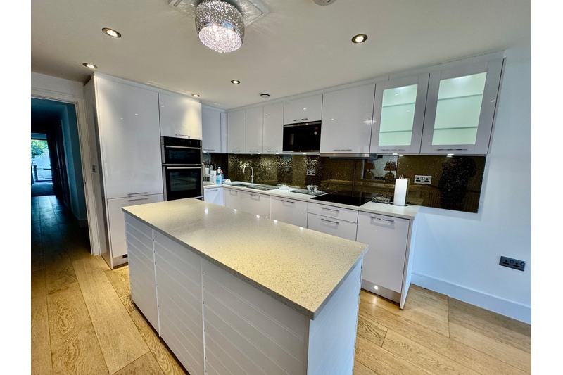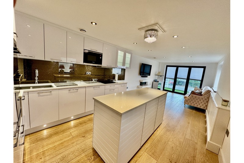 + Integrated kitchen, open plan to lounge, with wood laminate flooring, induction hob, electric double oven, fridge/freezer, washing machine, microwave & dishwasher