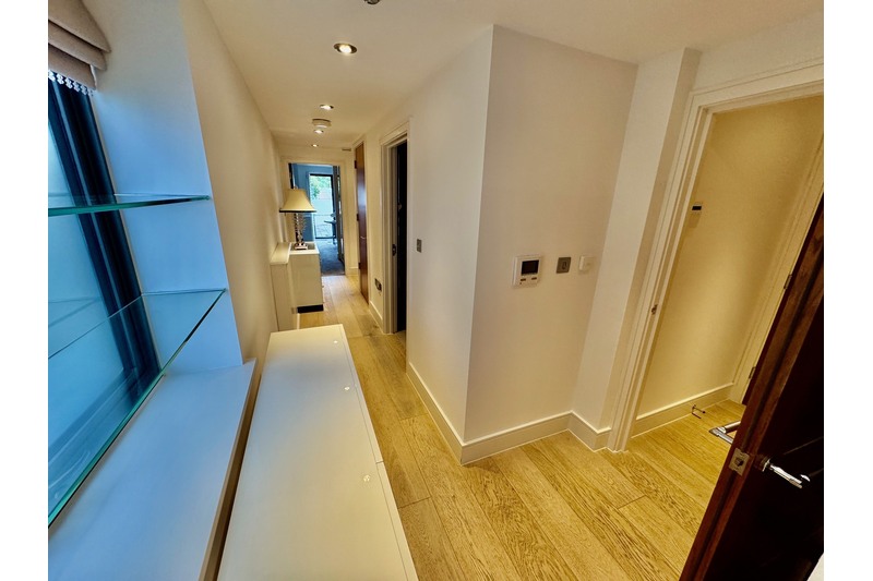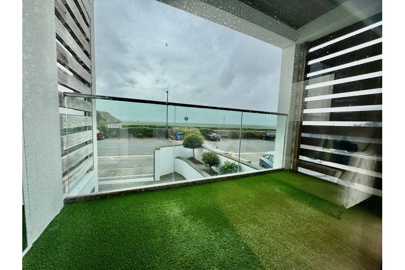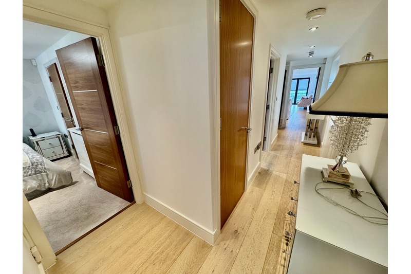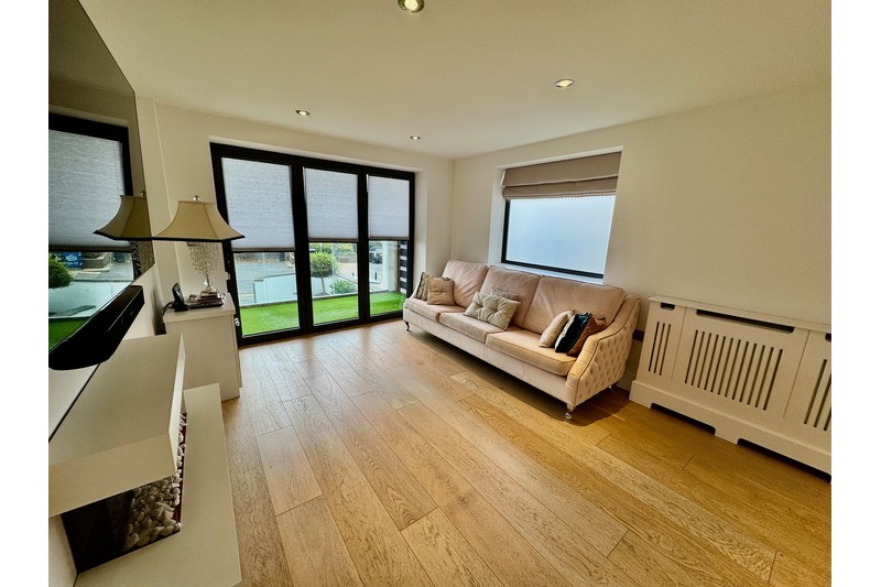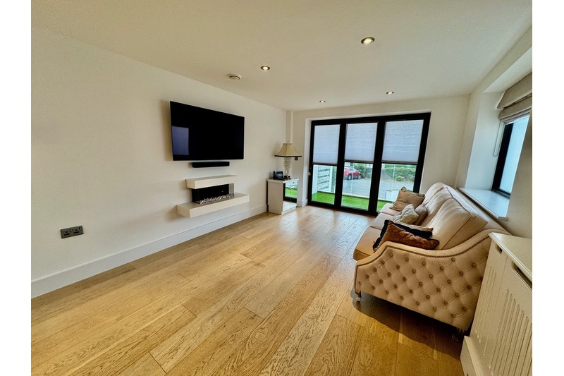 + Open plan south facing lounge with wood laminate flooring, bifold doors to balcony, wall mounted flatscreen TV with soundbar & sofa