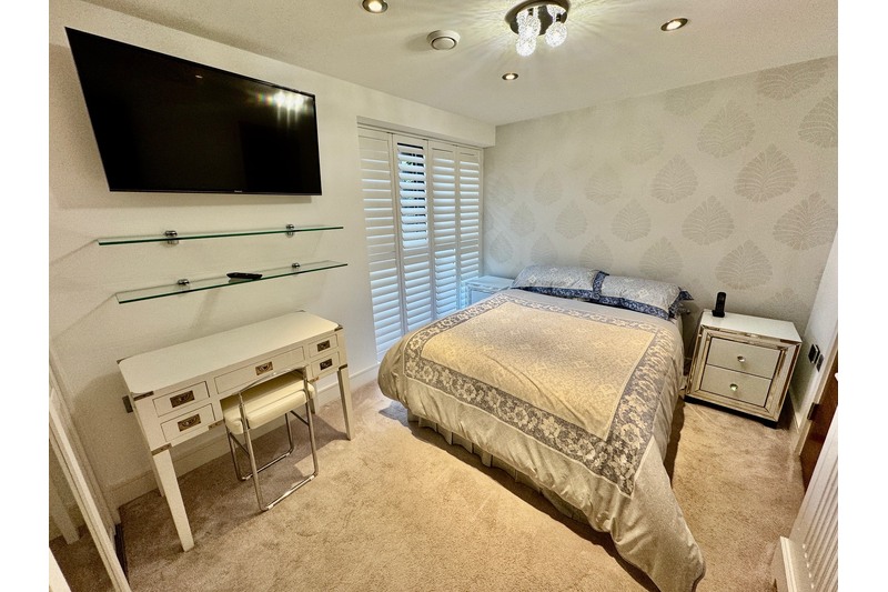 + Double sized main bedroom to rear with double bed, patio doors to garden, fitted wardrobes and en-suite shower room