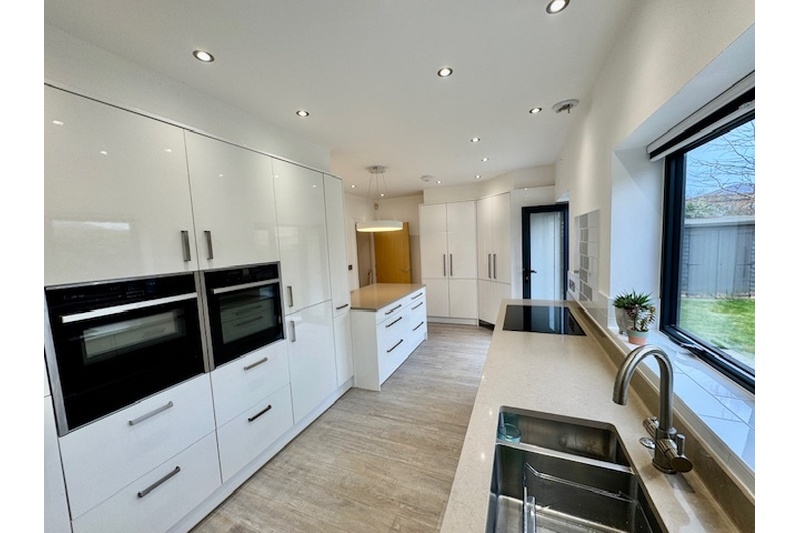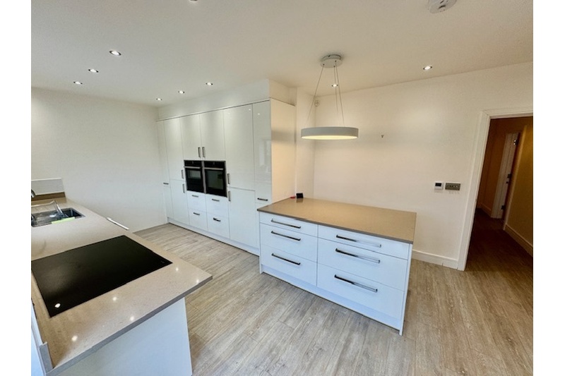 The kitchen has been redesigned with sleek high gloss cabinetry with high end integrated appliances and fixtures and fittings, granite worksurfaces, a walk in style pantry cupboard, utility cupboard, a generous size breakfast bar seating area and French doors leading to the garden.