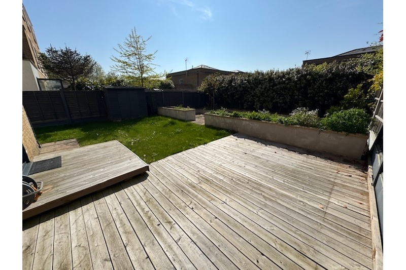 The rear garden includes various decked patio seating areas and a split level section that has been created as a Mediterranean style area.