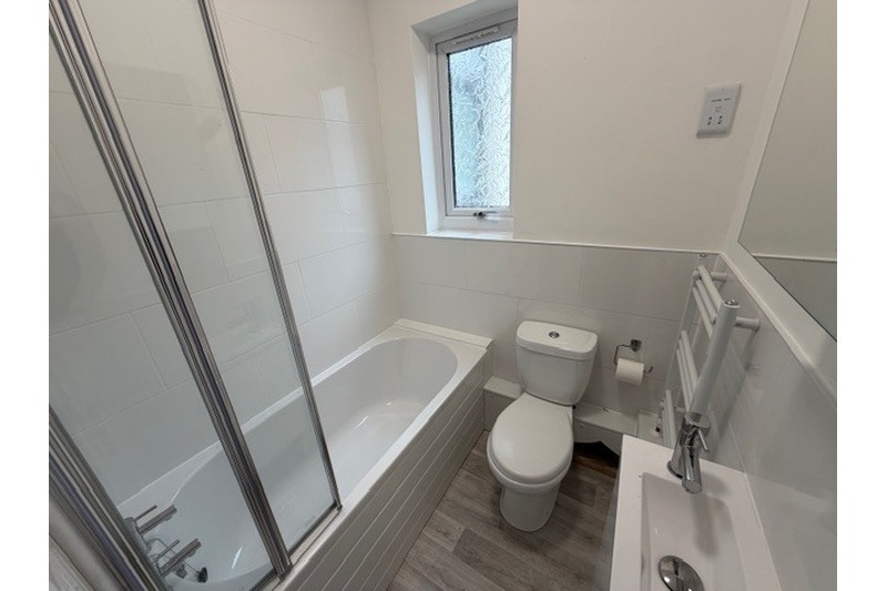 + New, white bathroom suite with shower over bath, hand basin & WC.